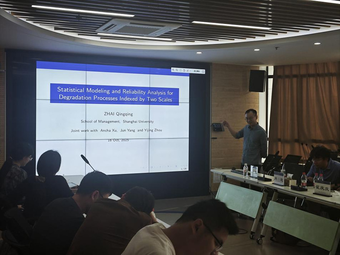 翟庆庆副教授以“Statistical Modeling and Reliability Analysis for Degradation Processes Indexed by Two Scales”为题展开本次讲座。本次讲座研究了工业产品的退化现象及建模优化问题——针对工业产品退化过程常与时间、使用量双因素相关,而仅用单一维度(时间或使用量)索引无法精准刻画退化规律的核心痛点,结合随机使用过程展开深入分析;提出了一种基于时间-使用量双维度索引的退化过程模型,该模型将双维度下的产品退化分别构建为相关联的非线性维纳过程,实现对退化过程更全面、精准的数学表征。同时,讲座还围绕所提模型的实际应用,开发了两种基于模拟的可靠性评估算法,系统研究了模型的推断问题(包括参数估计、过程拟合等关键环节);通过仿真实验验证了所设计的参数估计流程与可靠性评估算法的有效性,并以户外涂层材料的实际退化数据集为案例进行应用验证。结果表明,采用时间-使用量双维度索引退化过程,能显著提升工业产品退化建模的精度与适用性,为工业产品全生命周期可靠性分析、维护决策优化提供了更科学的理论支撑与技术工具。