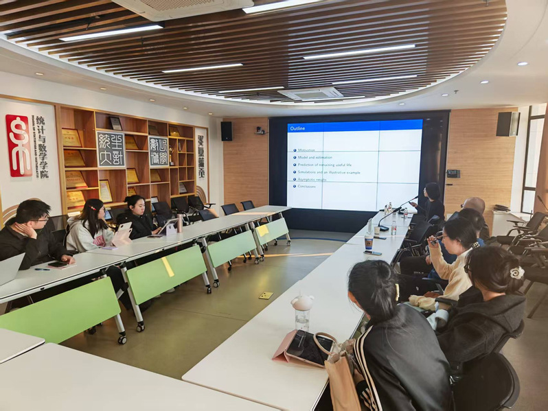 沈雁教授以“A nonparametric degradation model with monotonicity constraint on trend”为题展开本次讲座。本次讲座研究了单调性约束在应用统计建模中的关键作用,尤其聚焦于含随机波动的单调退化过程场景。研究指出,引入单调性约束不仅能提升模型估计精度,还可增强后续分析的预测可靠性。提出一种非参数建模框架,可在单调性约束下同步估计退化过程的单调整体趋势与关联随机波动,并确立了所提估计量的渐近性质,分析了单调性约束对趋势和波动的影响机制。针对依赖总体趋势和随机波动的剩余寿命预测问题,研究基于模型估计结果推导了剩余使用寿命分布的闭式表达式,为实际可靠性应用提供了高效实现方案。最后,通过大量模拟研究与真实案例验证所提方法的有效性。