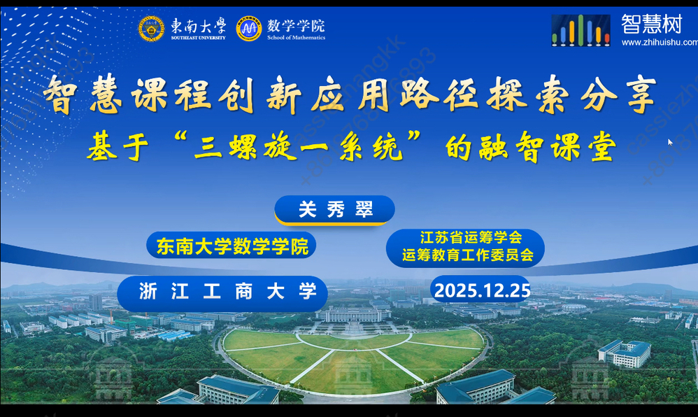 2025年12月25日,统计与数据科学色情网址大全组织开展智慧教育线上专题分享会,会议由色情网址大全学术副院长朱贺老师主持。本次会议特邀东南大学关秀翠教授分享AI赋能智慧课程的实践经验与创新成果,分享围绕“三螺旋”课程运行系统与“师生机”教学模式展开,为参会教师呈现了一套可落地、可复制的智慧教学解决方案。